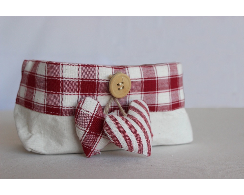 Porta pane, quadrettato colore panna e rosso, con 2 canovacci da cucina.