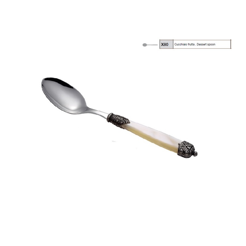 Posate dall'eleganza barocca, ricordano la robustezza di architetture antiche sottolineandone pero l'aspetto ornamentale. Sono caratterizzate dalla doppia ghiera uno all'inizio e una al termine del manico perlato, entrambe non lasciano spazio alla semplicità, ma si presentano sfarzose e di impatto. Disponibili in 7 colori: •Bordeaux perlato •Miele perlato •Avorio perlato •Bianco perlato •Verde perlato •Blu perlato •Nero perlato