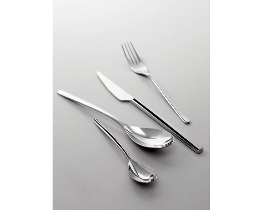 Posate dal design minimale e dal carattere deciso, con impugnatura dritta che sembra aprirsi in testa e lasciare sfogo alle posate.