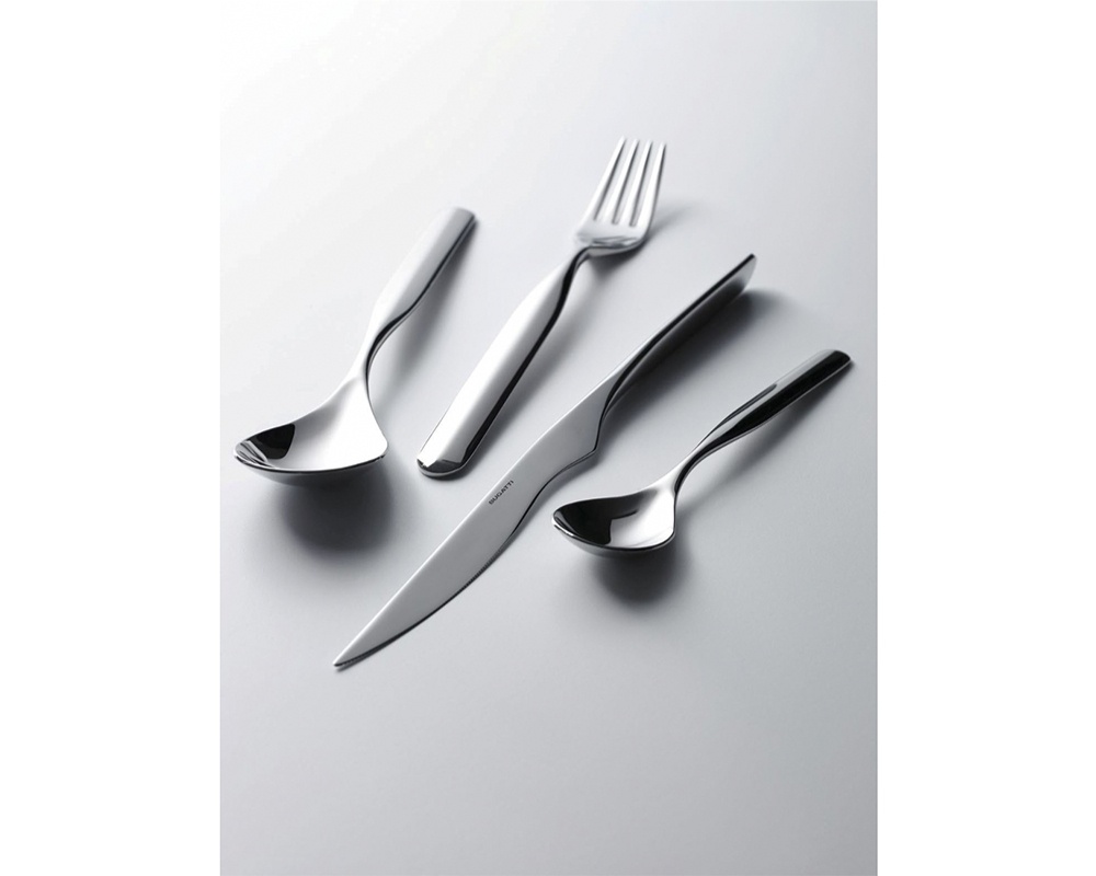 Posate in Acciaio inossidabile 18/10 forgiato, dal design eclettico, a suo agio sia in un contesto contemporaneo che elegante. L'impugnatura del coltello si differenzia da quella delle altre posate donando dinamismo al tutto il set.