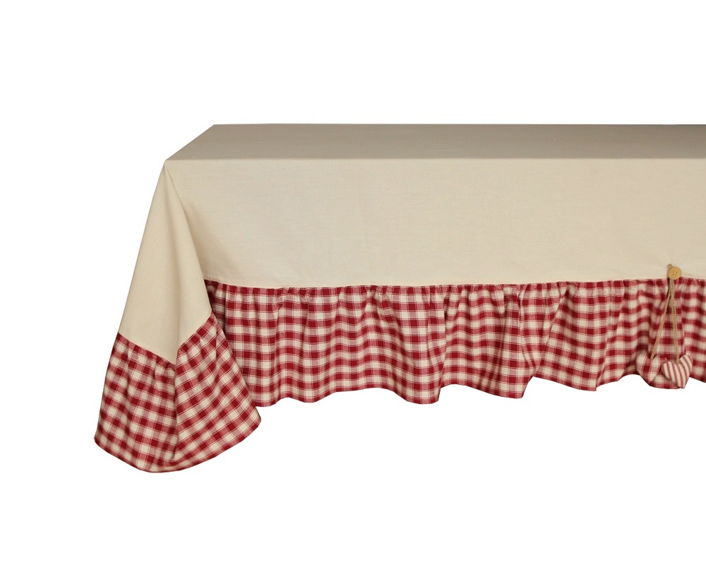 Tovaglia Shabby style colore panna, con voulant quadrettato rosso perimetrale.