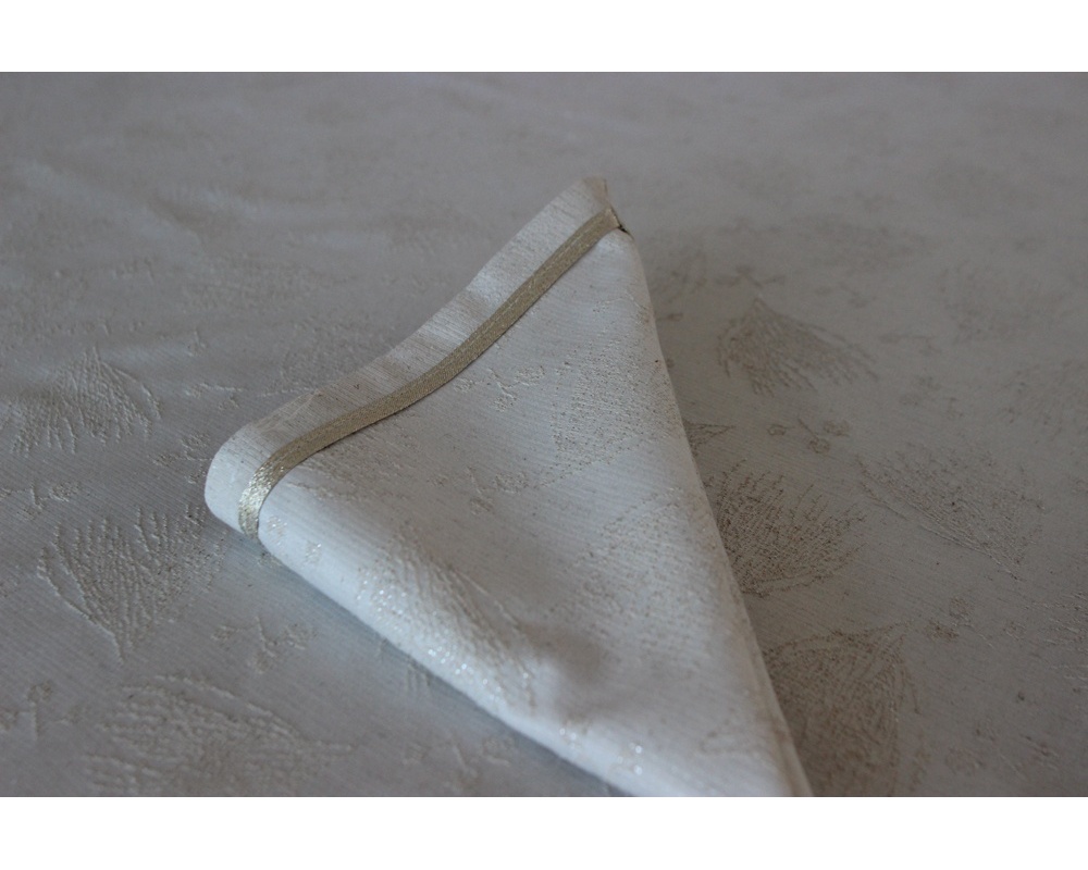 VALENTINA è un tovagliolo elegante con ricami filo oro (sottili ramoscelli). Ha un sbieco perimetrale con un filetto da 1 cm colore oro. E' un originale prodotto italiano cucito a mano, con base neutra beige (molto chiaro) e una fantasia di ramoscelli filo oro. Particolarmente adatto a pranzi e cene formali nelle quali si vuole preparare la tavola in modo elegante utilizzando calici e piatti bianchi o con decori. Le posate possono avere un manico inox magari con decori o filetti oro. Per completare al meglio la tavola si consiglia la tovaglia della stessa linea. Ideale in ricorrenze quali Natale, Pasqua, battesimi o semplicemente quando volete celebrare in modo impeccabile una occasione importante.